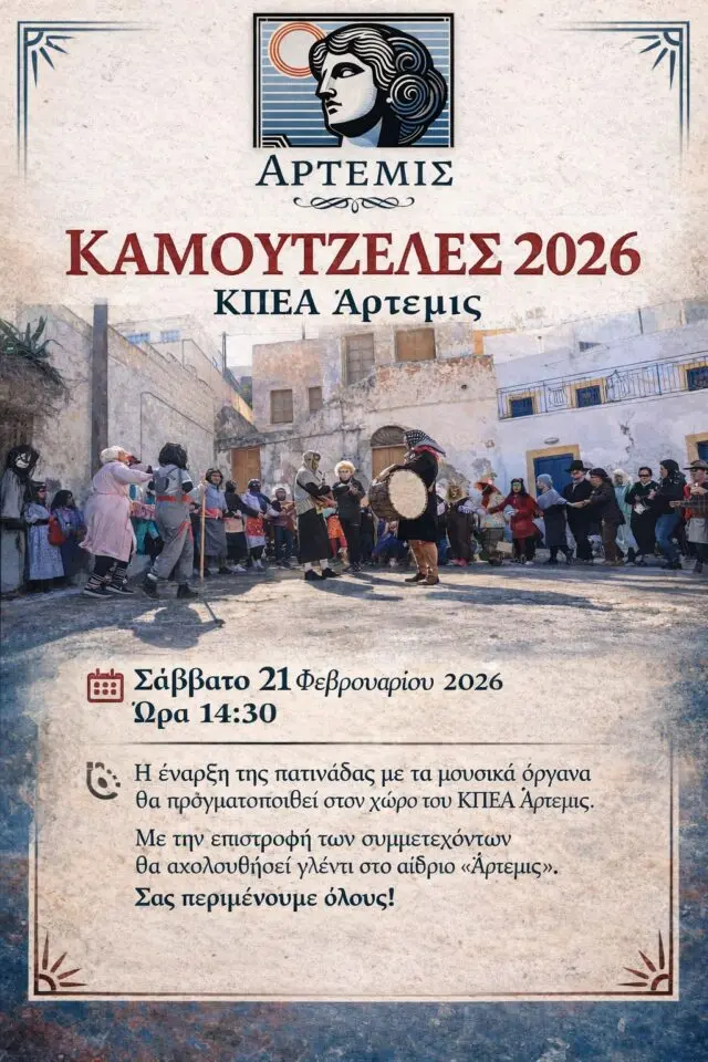το Σάββατο 21 Φεβρουαρίου 2026 στο χώρο του ΚΠΕΑ Άρτεμις στις 14:30, από όπου θα ξεκινήσει η μουσική πατινάδα προς την Αγία Μαρίνα και έπειτα θα επιστρέψουμε στο αίθριο Άρτεμις για την διεξαγωγή παραδοσιακού γλεντιού.