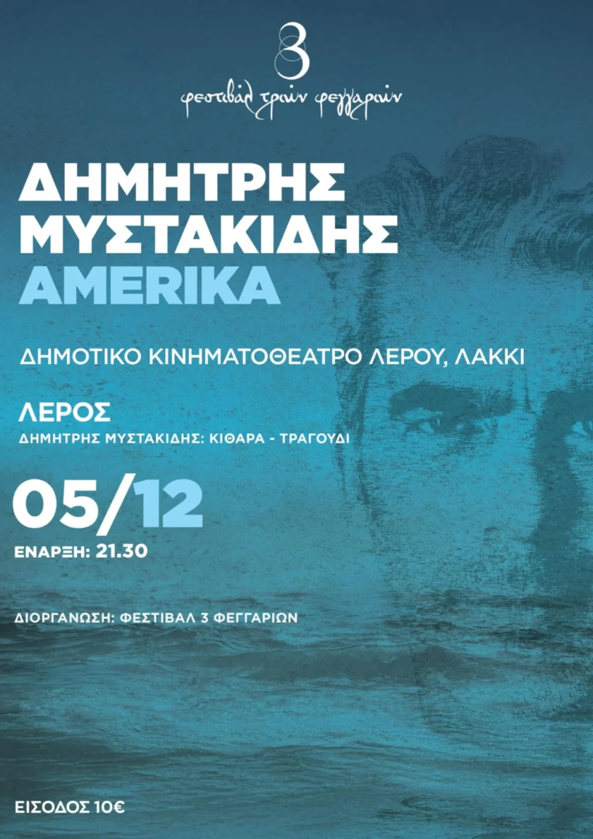 Την Παρασκευή 5 Δεκεμβρίου στο κινηματοθέατρο Λακκίου το Φεστιβάλ Τριών Φεγγαριών στη Λέρο φιλοξενεί τον Δημήτρη Μυστακίδη με το “Αμέρικα”, μια σόλο παράσταση που διασκευάζει και ερμηνεύει με την ιδιαίτερη τεχνική της «τσιμπητής κιθάρας» ρεμπέτικα τραγούδια που κυκλοφόρησαν και παίχτηκαν ζωντανά μόνο στην Αμερική από Έλληνες μετανάστες μουσικούς!