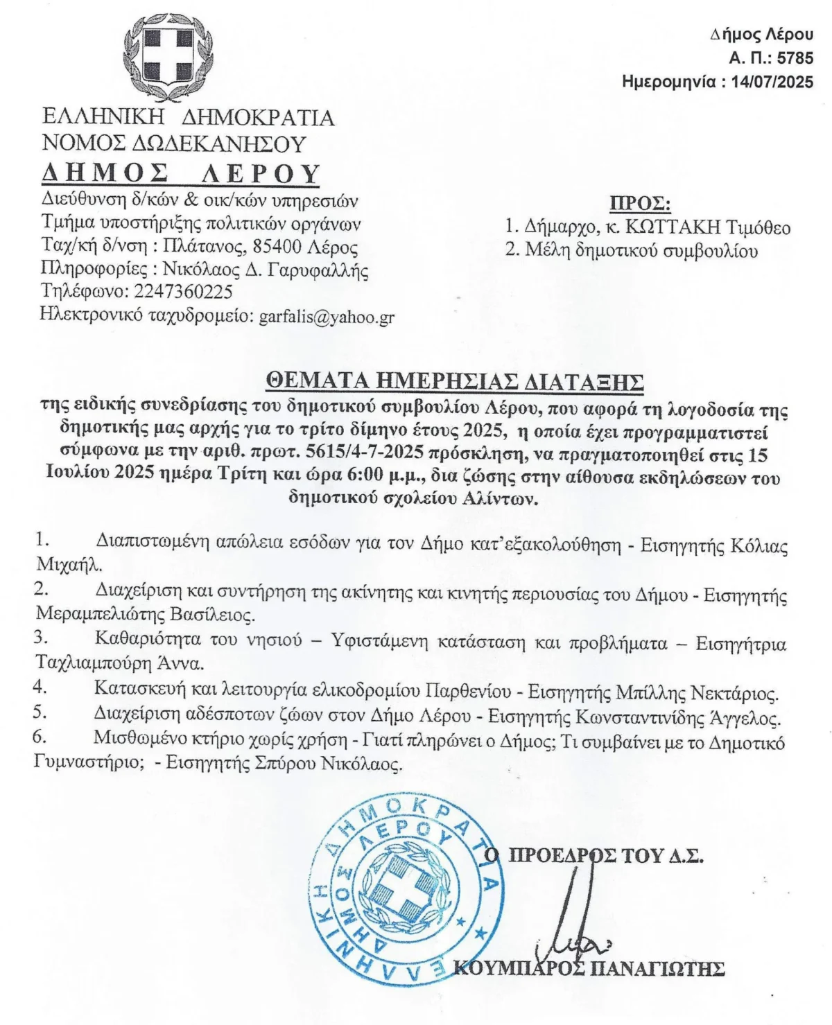 Την Τρίτη 15 Ιουλίου και ώρα 18:00 θα πραγματοποιηθεί η 4η Ειδική Συνεδρίαση Λογοδοσίας της Δημοτικής Αρχής Λέρου. Η συνεδρίαση θα διεξαχθεί δια ζώσης στην αίθουσα εκδηλώσεων του Δημοτικού Σχολείου Αλίντων.