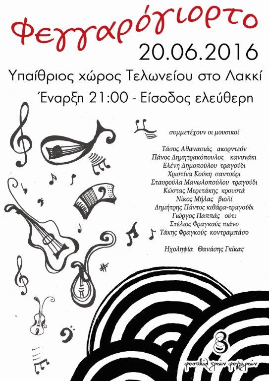 Ραντεβού λοιπόν στο «Φεγγαρόγιορτο» την Δευτέρα 20 Ιουνίου στον υπαίθριο χώρο του Τελωνείου στο Λακκί στις 9 το βράδυ, με μουσικές, φαγητό και κρασί και πολύ κέφι.