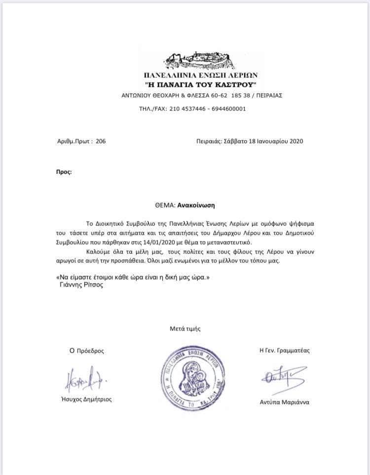 Ανακοίνωση εξέδωσε το ΔΣ της Πανελλήνιας Ένωσης Λερίων, με την οποία τάσσεται υπέρ των αποφάσεων και αιτημάτων του Δημάρχου και του Δημοτικού Συμβουλίου Λέρου για το μεταναστευτικό.