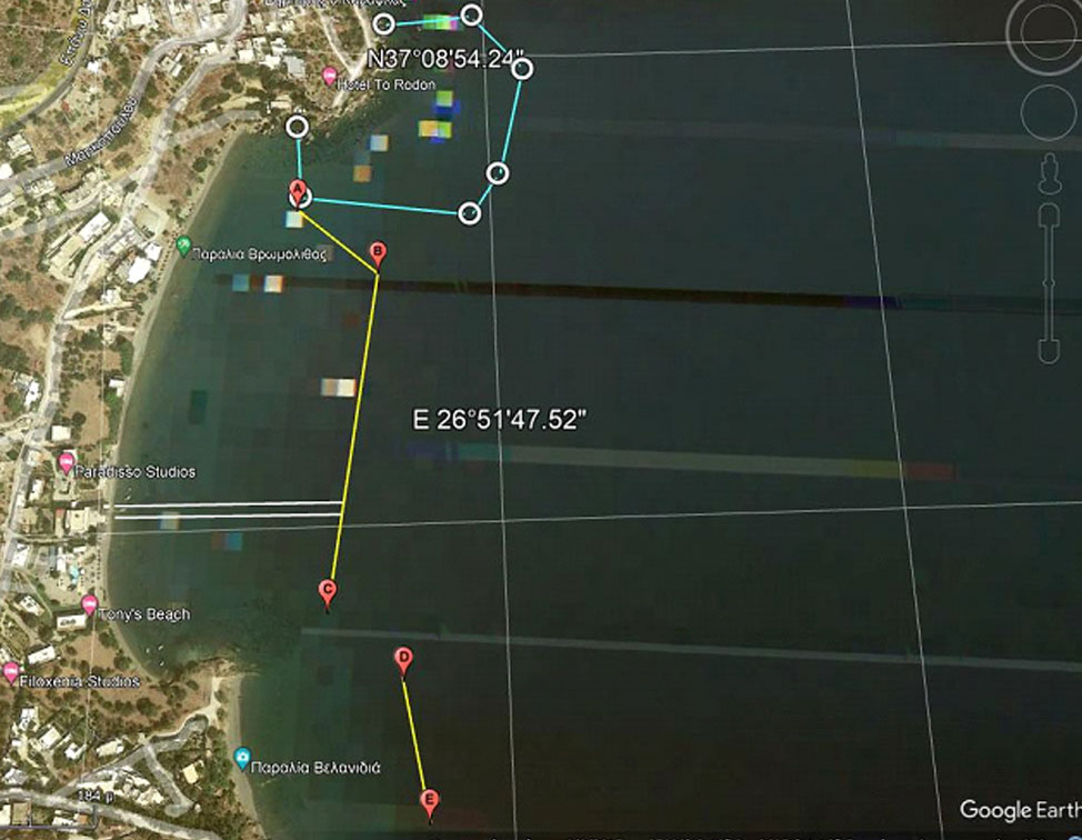 ε) Όρμου Παντελίου Δήμου Λέρου και συγκεκριμένα, στο θαλάσσιο χώρο που αποτελεί χώρο λήψης θαλάσσιου λουτρού και περικλείεται από την παραλιακή χερσαία ζώνη και τις νοητές ευθείες που ορίζουν τα κάτωθι σημεία, όπως αποτυπώνονται στο επισυναπτόμενο απόσπασμα δορυφορικής απεικόνισης:
