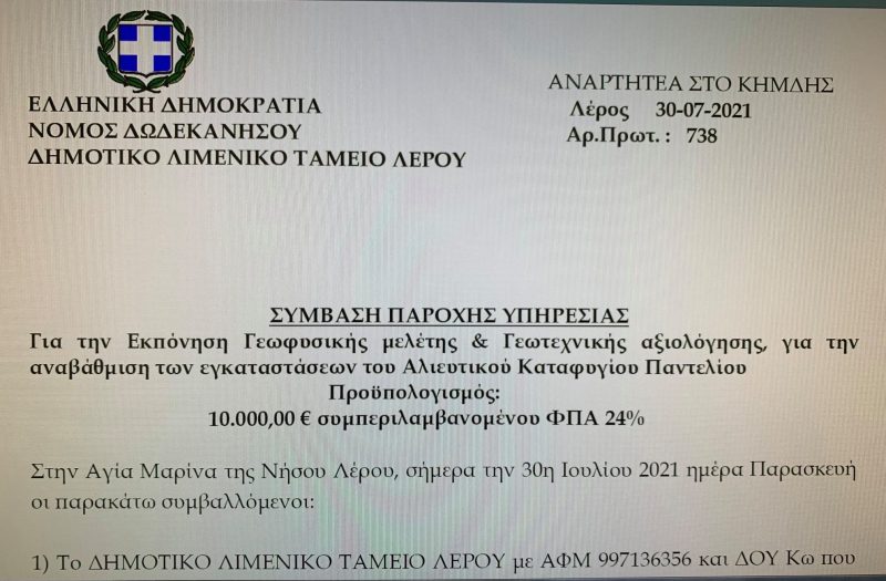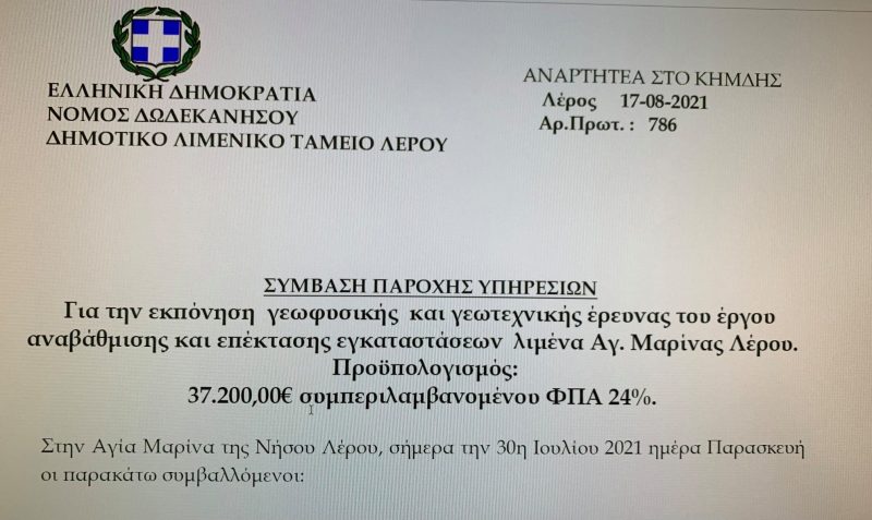 ΔΕΛΤΙΟ ΤΥΠΟΥ – Ο Πρόεδρος του Δημοτικού Λιμενικού Ταμείου Λέρου είναι στην ευχάριστη θέση να ανακοινώσει την υπογραφή των Συμβάσεων των Γεωτεχνικών και Γεωφυσικών Ερευνών συνολικής αξίας 47.200€ που θα πραγματοποιηθούν στο λιμάνι της Αγίας Μαρίνας και στο αλιευτικό καταφύγιο Παντελίου το αμέσως επόμενο διάστημα και αφορούν την αναβάθμιση και επέκταση των συγκεκριμένων λιμένων.