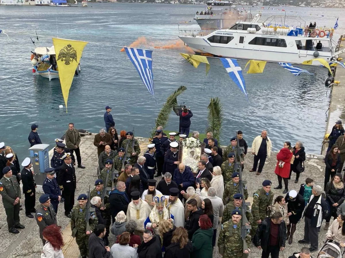 Μετά το πέρας της Θείας Λειτουργίας και του Μεγάλου Αγιασμού, με Ιερά Πομπή και την συνοδεία της Δημοτικής Φιλαρμονικής και αγήματος του Στρατού, ο Θεοφιλέστατος, συνοδευόμενος υπό ιερέων και των πολιτικών και στρατιωτικών Αρχών, μετέβη στον λιμένα της Αγίας Μαρίνας Λέρου για την τελετή της καταδύσεως του Τιμίου Σταυρού. Εκεί με την συμμετοχή κόσμου, οι τολμηροί νεαροί κολυμβητές βούτηξαν στη θάλασσα για να πιάσουν το σταυρό. Τυχερός κολυμβητής φέτος ήταν ο Πέτρος Μούγκρος, στον οποίο ο Θεοφιλέστατος εδώρισε επιστήθιο Σταυρό, δωρεά της Ενορίας Θ. Μ. Σωτήρος Χριστού.
