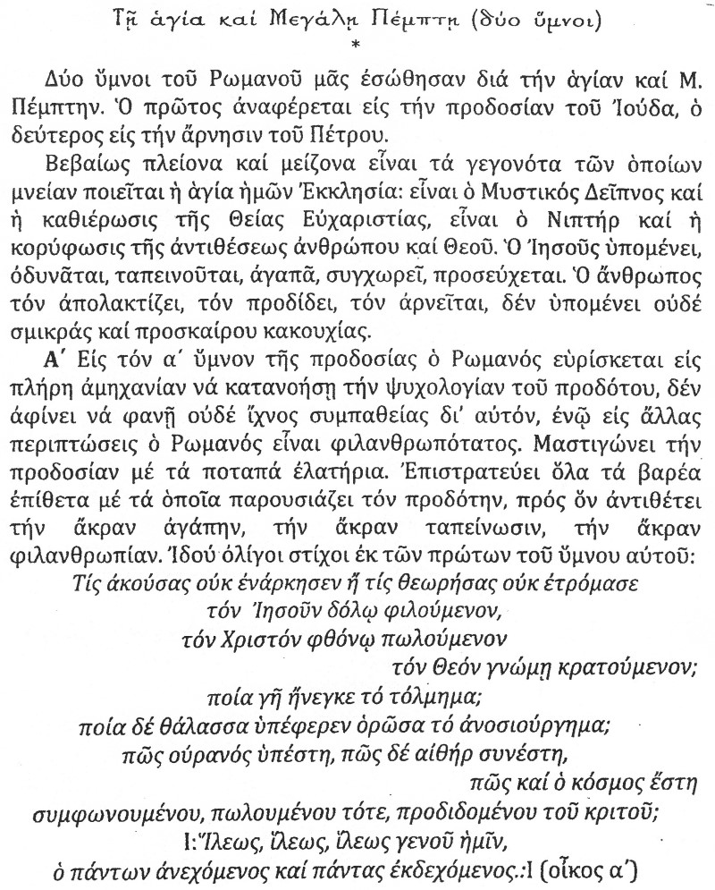Την Αγία και Μεγάλη Πέμπτη εορτάζουμε τον Ιερό Νιπτήρα, το Μυστικό Δείπνο, την υπερφυά Προσευχή και την Προδοσία. Τις τέσσερις αυτές πράξεις μας προβάλλει η Αγία μας Εκκλησία, οι οποίες έγιναν η μία μετά την άλλη το ίδιο βράδυ.