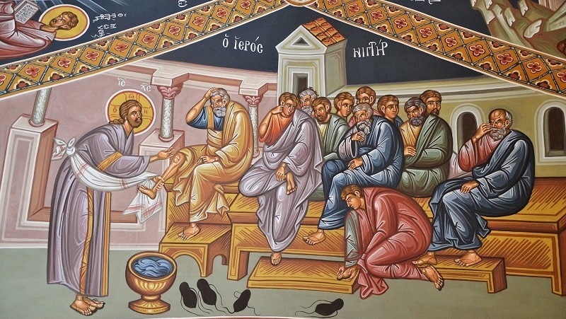 Ο Ιησούς σκύβει και πλένει τα πόδια των μαθητών του, ταπεινά σαν δούλος, ψιθυρίζοντας «ουκ ήλθον διακονηθήναι, αλλά διακονήσαι».
