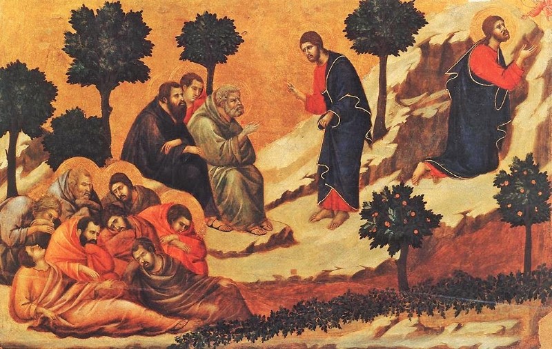 Έπειτα ο Ιησούς, μέσα στο σκοτάδι της νύχτας εκείνης, πηγαίνει στο όρος των Ελαιών με τους μαθητές του και προσεύχεται γεμάτος αγωνία. «Πάτερ, ει βούλει παρενεγκείν τούτο το ποτήριον απ᾿ εμού· πλην μη το θέλημά μου, αλλά το σον γινέσθω». Πατέρα, αν θέλεις, απομάκρυνε αυτό το ποτήρι από εμένα. Όμως όχι το θέλημά μου, αλλά το δικό σου να γίνει. Φανερώθηκε τότε σ’ Αυτόν άγγελος από τον ουρανό που τον ενίσχυε. Και επειδή έπεσε σε αγωνία, εντονότερα προσευχόταν. Και έγινε ο ιδρώτας του σαν θρόμβοι αίματος που κατέβαιναν στη γη…
