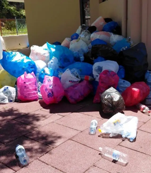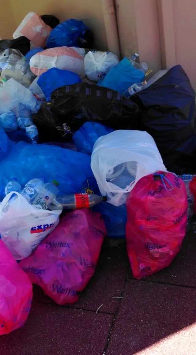 Όπως φαίνεται και στις φωτογραφίες, μεγάλες ποσότητες πλαστικών μπουκαλιών που έχουν συγκεντρωθεί για ανακύκλωση παραμένουν στον χώρο του σχολείου εδώ και περίπου δέκα ημέρες, παρά τις επανειλημμένες εκκλήσεις των εκπαιδευτικών προς τον Δήμο για την απομάκρυνσή τους.