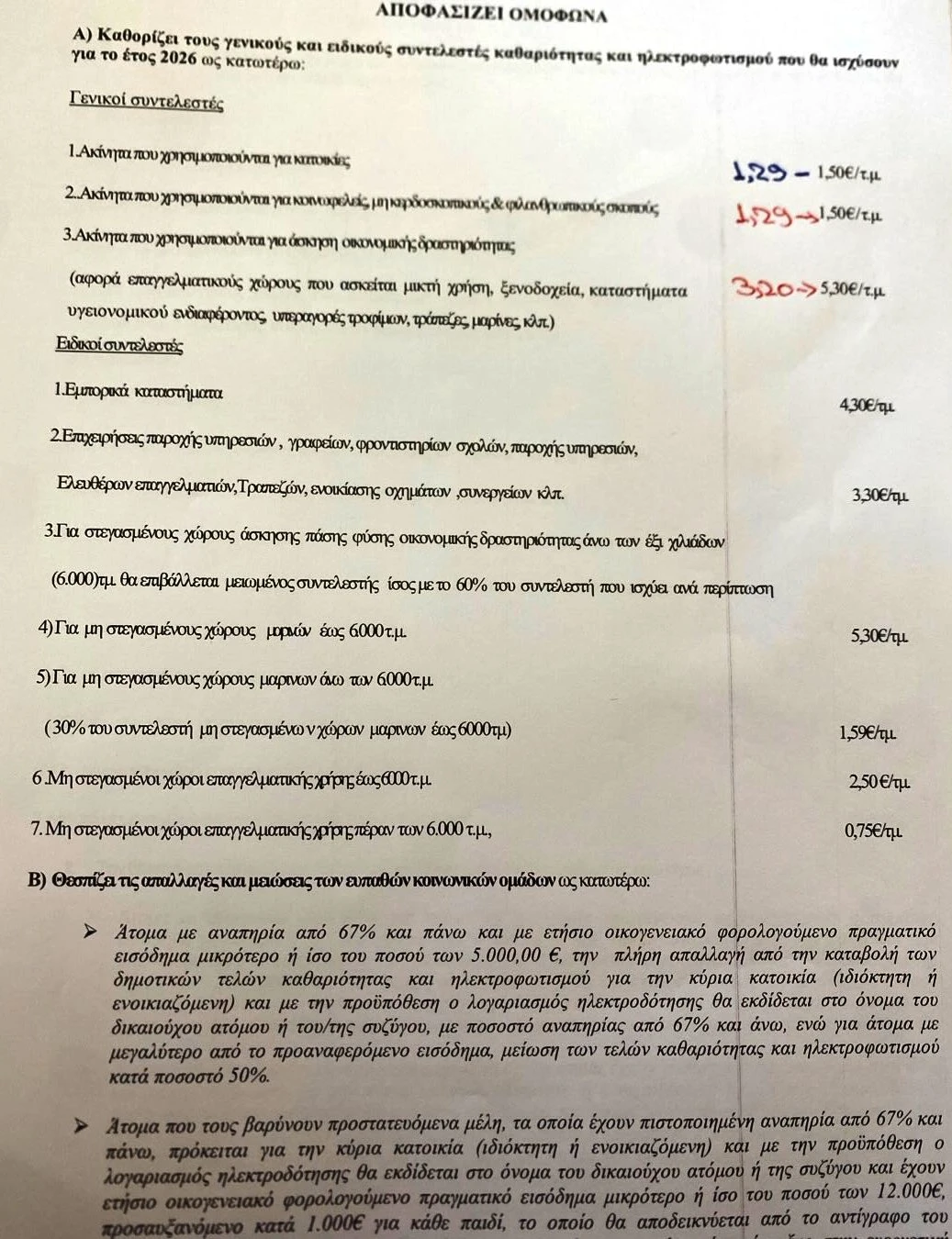 • Καταστήματα – Ξενοδοχεία κ.λπ.: από 3,20 €/τ.μ. σε 5,30 €/τ.μ.