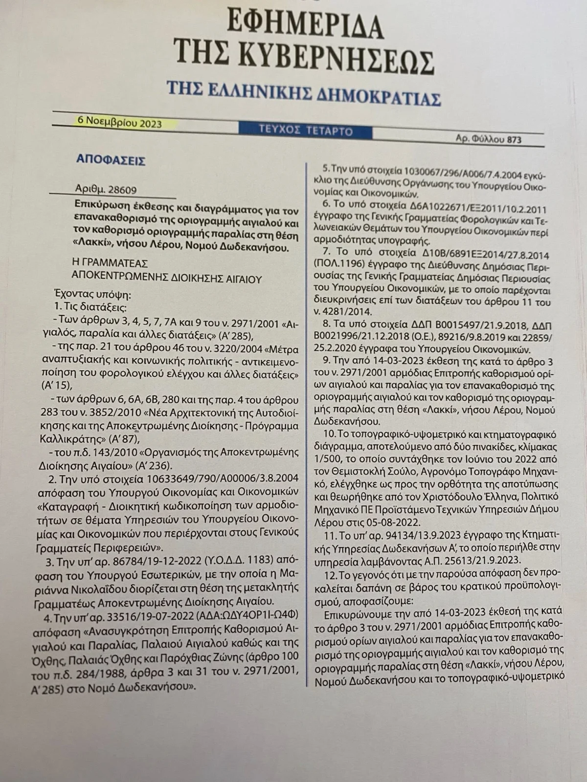 • Λιμένας Λακκίου – δημοσιευμένο ΦΕΚ αιγιαλού