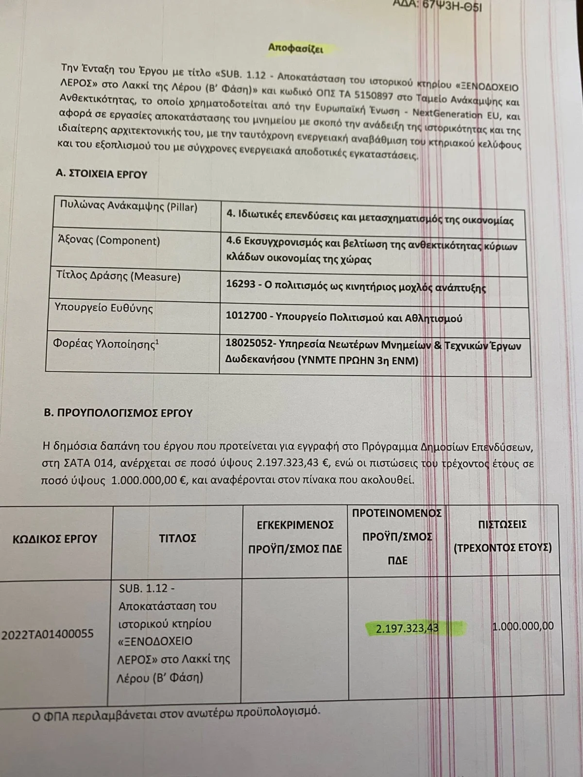 • Ξενοδοχείο «Λέρος» ολοκληρωμένος φάκελος & χρηματοδότηση 2.197.323.43 Δημοπρατημένο από το Υπουργείο Πολιτισμού έργο με Ανάδοχο.