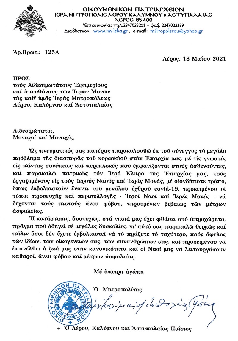 Ο Σεβασμιώτατος Μητροπολίτης μας κ.κ. Παΐσιος, απέστειλε σήμερα, 18-5-2021, Εγκύκλιο προς τους αιδεσιμωτάτους εφημερίους και τους υπευθύνους των Ιερών Μονών, μοναχούς και μοναχές της καθ’ ημάς Ιεράς Μητροπόλεως Λέρου, Καλύμνου και Αστυπαλαίας, με την προτροπή όπως το ταχύτερο εμβολιαστεί ο Ιερός Κλήρος, και οι εργαζόμενοι καθ’ οιονδήποτε τρόπο στους Ι.Ναούς και Ι.Μονές της Επαρχίας μας, προκειμένου να επανέλθει η ζωή μας στην κανονικότητα και οι Ιεροί Ναοί και Ιερές Μονές να παραμείνουν καθαροί , χωρίς φόβο και μέτρα ασφαλείας.