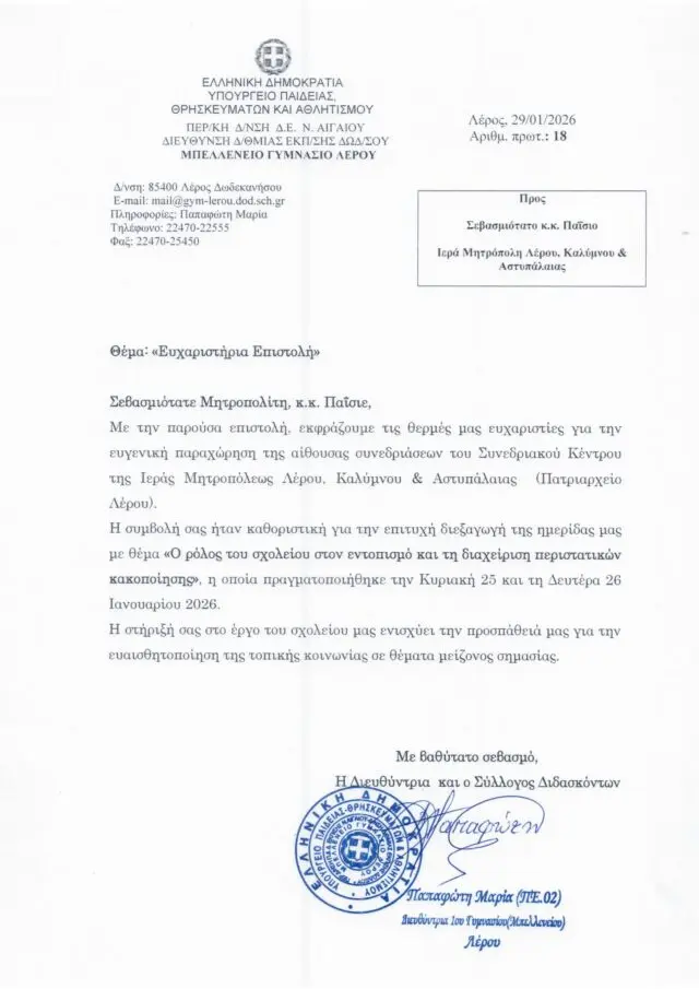 Ευχαριστήρια Επιστολή εξέδωσε η διευθύντρια του Μπελλένειου Γυμνάσιου Λέρου κα Παπαφώτη προς τον Σεβασμιώτατο Μητροπολίτη κ.κ. Παΐσιο, αναφέροντας τα παρακάτω: