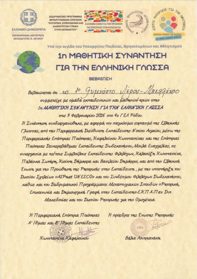 Ευχαριστήρια επιστολή εξέδωσε η διευθύντρια του 1ου Γυμνασίου Λέρου (Μπελλένειο), εκφράζοντας την ευγνωμοσύνη της για την έμπρακτη στήριξη που δόθηκε σε δράσεις του σχολείου.