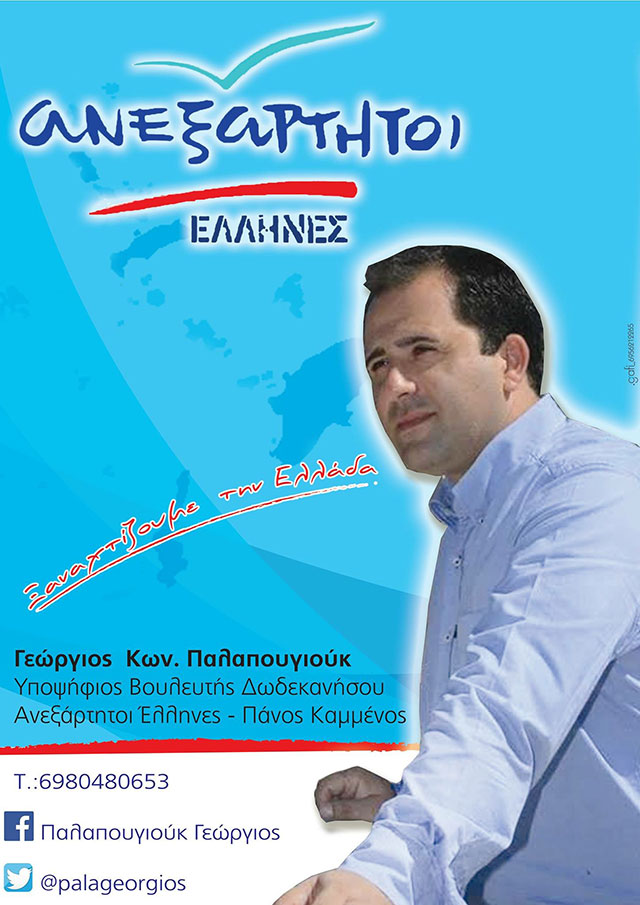 Φίλες και φίλοι, αγαπητοί συμπατριώτες , με αίσθημα ευθύνης και αποφασιστικότητας με απότερο σκοπό την βοήθεια στο να αλλάξει η χώρα μας δημιουργώντας καλύτερες συνθήκες για τον λαό και τα παιδιά μας , ανακοινώνω την εκ νέου υποψηφιότητά μου με τους Ανεξάρτητους Έλληνες στα Δωδεκάνησα.