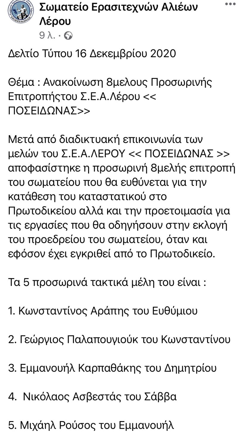 Το Δελτίο Τύπου του Σωματείου που παρουσιάζει την προσωρινή 8μελής επιτροπή :