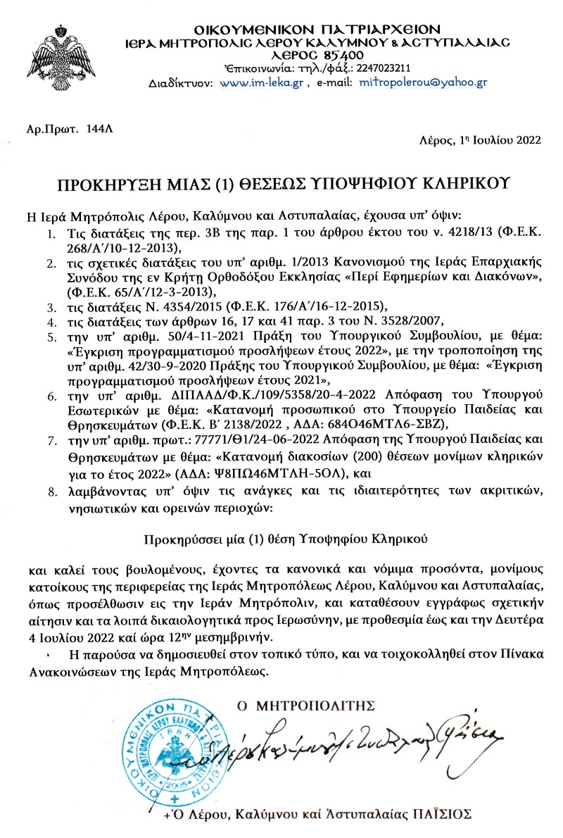 ΠΡΟΚΗΡΥΞΗ ΜΙΑΣ (1) ΘΕΣΕΩΣ ΚΛΗΡΙΚΟΥ ΣΤΗΝ ΙΕΡΑ ΜΗΤΡΟΠΟΛΗ ΛΕΡΟΥ