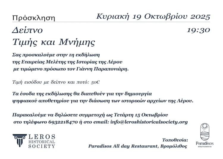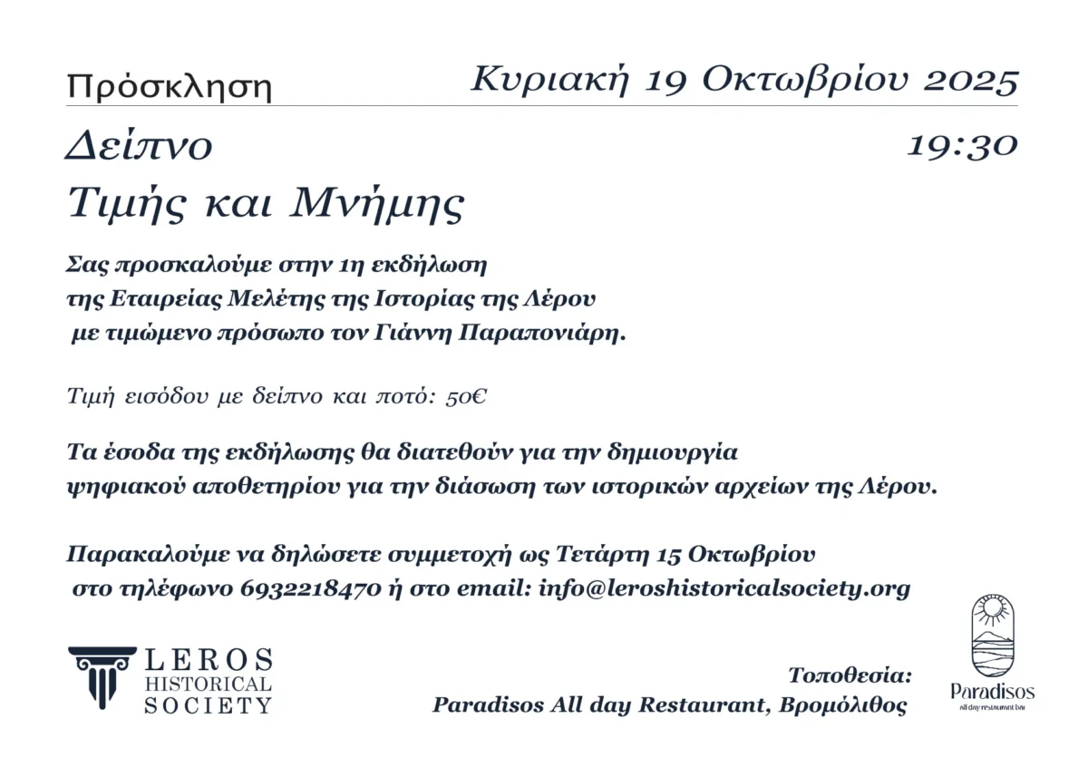 Πρόσκληση: “Δείπνο Τιμής και Μνήμης” από την Εταιρεία Μελέτης της Ιστορίας της Λέρου