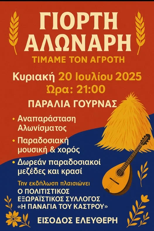 ΠΡΟΣΚΛΗΣΗ – Σας προσκαλούμε την Κυριακή 20/07/2025 και ώρα 21:00 στην παραλία της Γούρνας στη «Γιορτή Αλωνάρη – Αγρότη» που διοργανώνει ο Δήμος Λέρου με λέρικο γλέντι, κρασί δωρεάν και παραδοσιακούς μεζέδες.