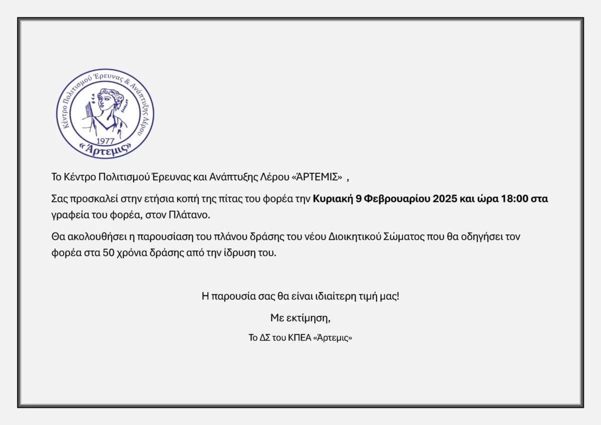 Το Κέντρο Πολιτισμού Έρευνας και Ανάπτυξης Λέρου «ΆΡΤΕΜΙΣ», Σας προσκαλεί στην ετήσια κοπή της πίτας του φορέα την Κυριακή 9 Φεβρουαρίου 2025 και ώρα 18:00 στα γραφεία του φορέα, στον Πλάτανο.