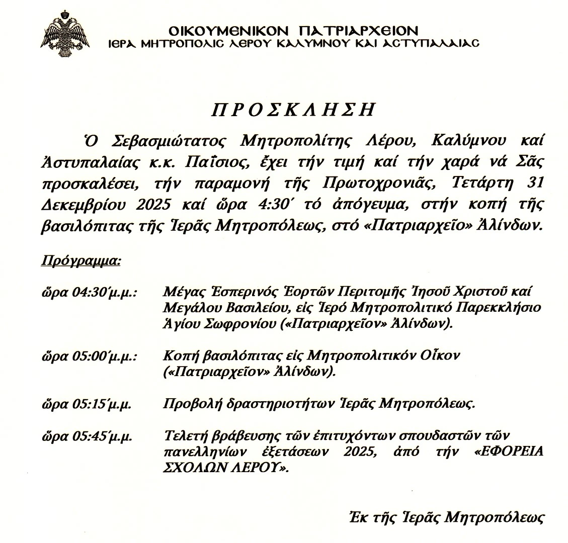 Ο Σεβασμιώτατος Μητροπολίτης Λέρου, Καλύμνου και Αστυπαλαίας κ.κ. Παΐσιος απευθύνει πρόσκληση για την κοπή της βασιλόπιτας της Ιεράς Μητροπόλεως, που θα πραγματοποιηθεί την Τετάρτη 31 Δεκεμβρίου 2025, παραμονή της Πρωτοχρονιάς, στις 4:30 το απόγευμα, στο «Πατριαρχείο» Αλίντων.