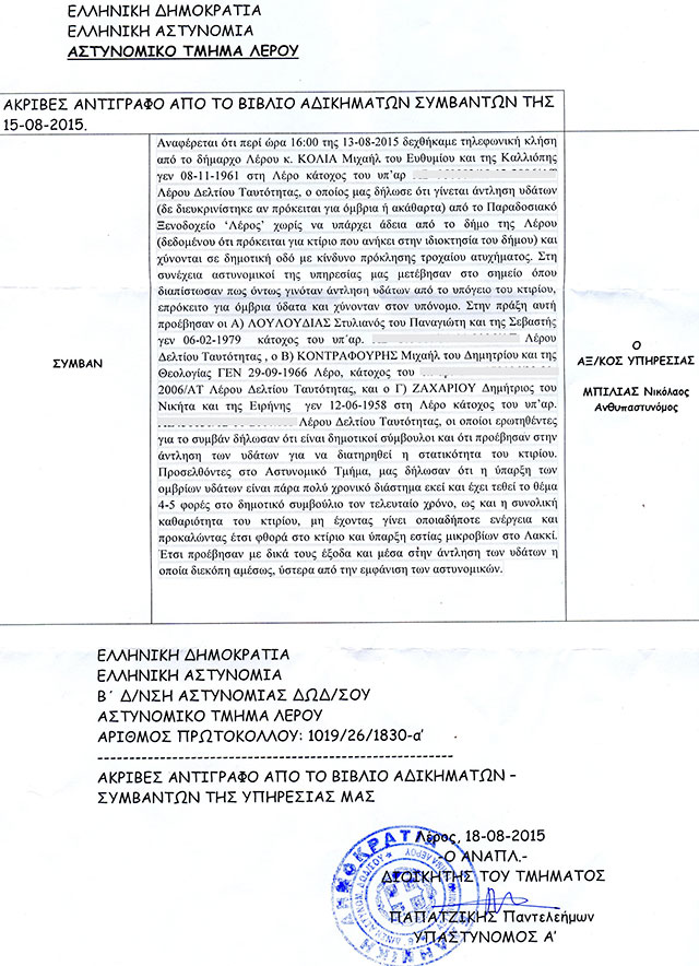 Όπως αναφέρεται στο αντίγραφο του βιβλίου συμβάντων, τα νερά (όμβρια ύδατα) από την άντληση των υδάτων χύνονταν σε υπόνομο (επισυνάπτεται σχετική φωτογραφία) και όχι σε δημοτική οδό όπως ισχυρίστηκε ο Δήμαρχος Λέρου.