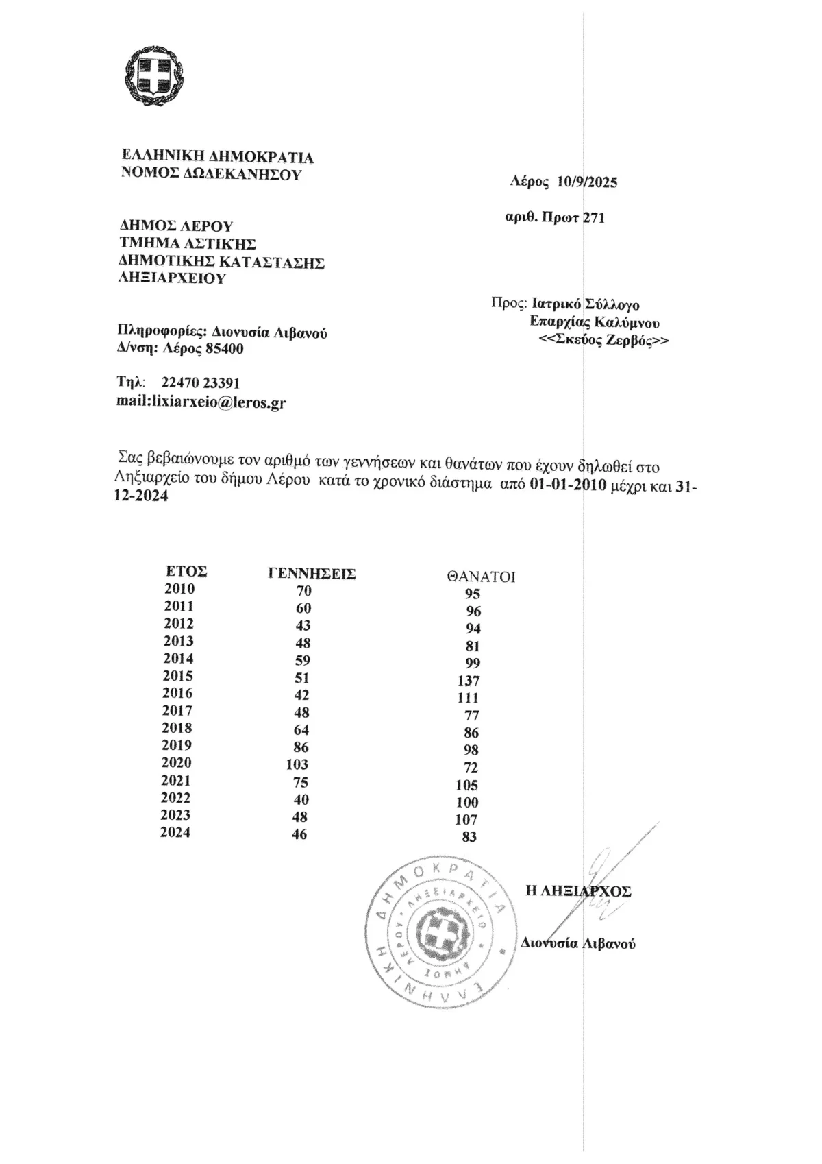 Σε συνέχεια της συνομιλίας που είχαμε στην Κάλυμνο την περασμένη Πέμπτη 11/09/2025 σας ενημέρωσα για το πρόβλημα της υπογεννητικότητας που υπάρχει και στα ακριτικά νησιά μας, δείξατε πολύ μεγάλο ενδιαφέρον και για αυτό τον λόγο σας αποστέλνω τα επίσημα στοιχεία γεννήσεων-θανάτων που έχουμε από τα ληξιαρχεία Καλύμνου και Λέρου για το χρονικό διάστημα 2010-2024.