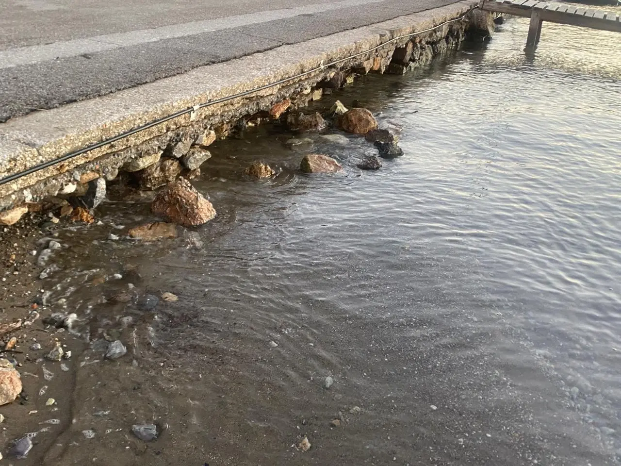 Όπως αποτυπώνεται και στην συγκεκριμένη εικόνα, παρατηρείται εκτεταμένη υποσκαφή του οδοστρώματος από τη θαλάσσια διάβρωση, με αποτέλεσμα να δημιουργούνται κενά κάτω από την άσφαλτο και να απογυμνώνεται η βάση στήριξης του δρόμου. Το φαινόμενο αυτό, εάν δεν αντιμετωπιστεί έγκαιρα, ενέχει σοβαρό κίνδυνο.
