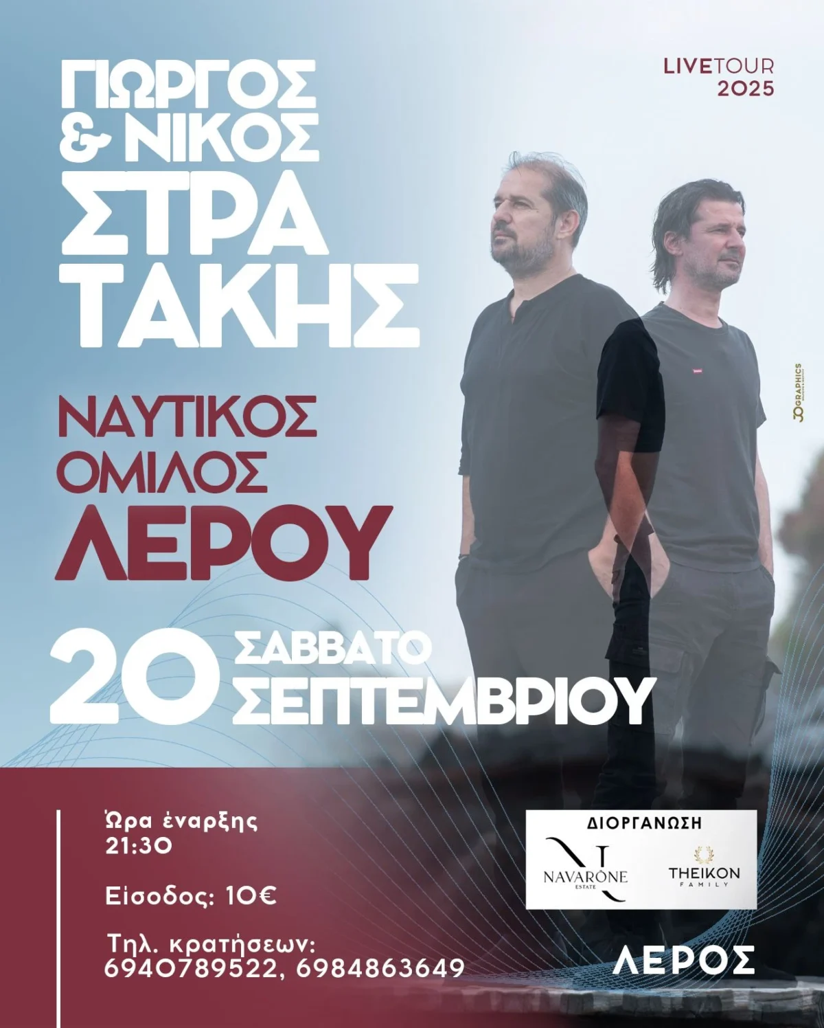 Με μεγάλη χαρά σας ανακοινώνουμε ότι οι μοναδικοί Γιώργος & Νίκος Στρατάκης με την ορχήστρα τους συνεχίζοντας το καλοκαιρινό τους tour έρχονται στη Λέρο για ένα ανεπανάληπτο LIVE!