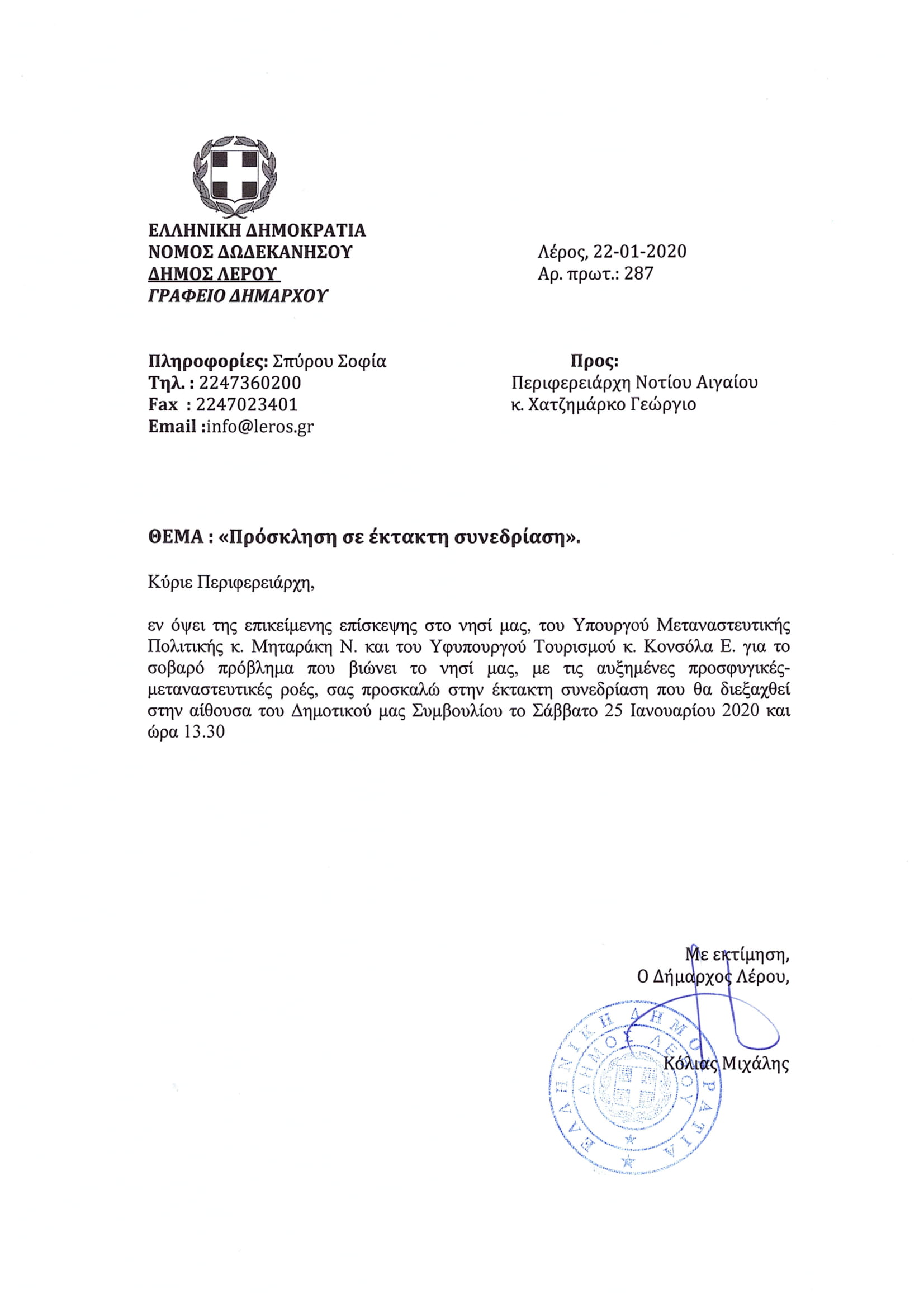 Με αφορμή την άφιξη του υπουργού θα πραγματοποιηθεί έκτακτη συνεδρίαση του δημοτικού συμβουλίου Λερου στις 13:30 το μεσημέρι, στην οποία ο Δήμαρχος Λέρου κάλεσε με έγγραφό του τον Περιφερειάρχη Νοτίου Αιγαίου κ. Γιώργο Χατζημάρκο.