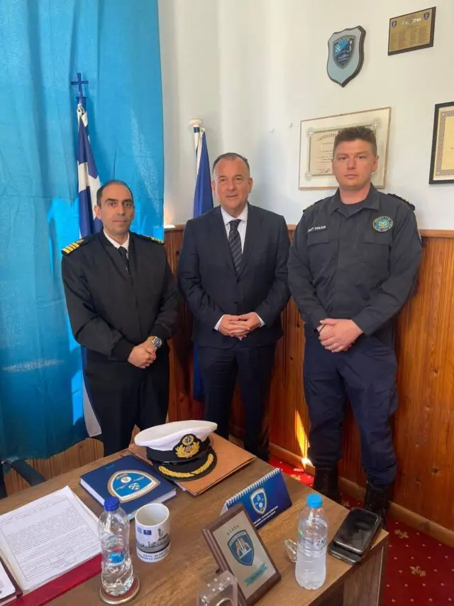 Στη συνέχεια, επισκέφθηκε το Λιμεναρχείο Λέρου, όπου συναντήθηκε με τον Λιμενάρχη και τον Υπολιμενάρχη, ανταλλάσσοντας ευχές με τα στελέχη του Λιμενικού Σώματος και εκφράζοντας την εκτίμησή του για το έργο τους.
