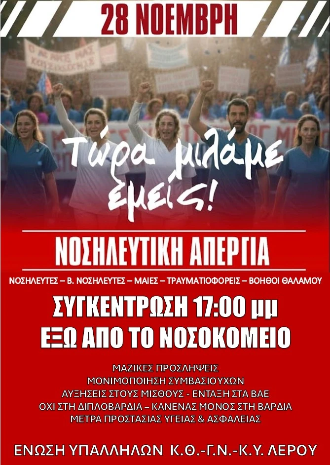 ΑΝΑΚΟΙΝΩΣΗ – Η Ένωση Υπαλλήλων Κ.Θ.–Γ.Ν. Λέρου στηρίζει και συμμετέχει αποφασιστικά στην πανελλαδική νοσηλευτική κινητοποίηση της 28ης Νοεμβρίου.