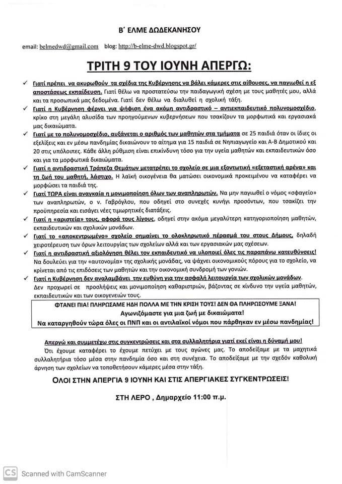Το πρωί της Τρίτης, 9 Ιουνίου 2020, ο Δήμαρχος Λέρου κ. Μιχάλης Κόλιας δέχτηκε στο γραφείο του αντιπροσωπεία εκπαιδευτικών της Α’Βάθμιας Εκπαίδευσης, οι οποίοι συμμετείχαν στις απεργιακές συγκεντρώσεις της Β’ ΕΛΜΕ Δωδεκανήσου και επέδωσαν σχετικό ψήφισμα.
