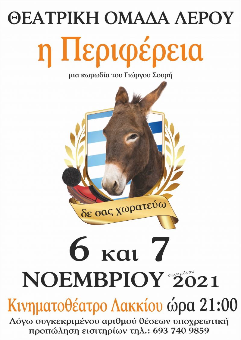 Η Θεατρική Ομάδα Λέρου παρουσιάζει την κωμωδία του Γιώργου Σουρή « Η Περιφέρεια» 06 και 07 Νοεμβρίου 2021 και ώρα 21:00 στο Δημοτικό Κινηματοθέατρο Λακκίου