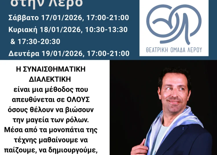 Η Θεατρική Ομάδα Λέρου διοργανώνει ένα ξεχωριστό βιωματικό σεμινάριο με τίτλο «Συναισθηματική Διαλεκτική», με εισηγητή τον Στέλιο Καλαθά. Πρόκειται για μια πρωτότυπη μέθοδο που γεννήθηκε μέσα από την πολυετή εμπειρία του στο θέατρο και τη θεατρική εκπαίδευση και εστιάζει στη δυναμική των συναισθημάτων, στην αυθεντική επικοινωνία και στην ελεύθερη αυτοέκφραση μέσω των κωδίκων της υποκριτικής.