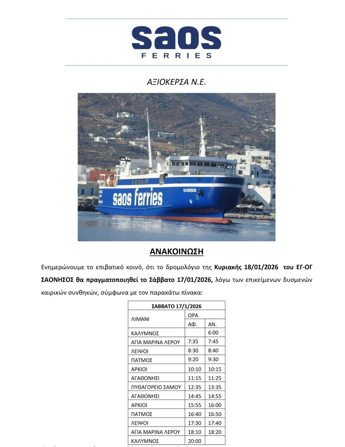 Η SAOS Ferries ενημερώνει το επιβατικό κοινό ότι το προγραμματισμένο δρομολόγιο της Κυριακής 18/01/2026 του Ε/Γ-Ο/Γ «ΣΑΟΝΗΣΟΣ» θα πραγματοποιηθεί τελικά το Σάββατο 17/01/2026, λόγω των επικείμενων δυσμενών καιρικών συνθηκών.