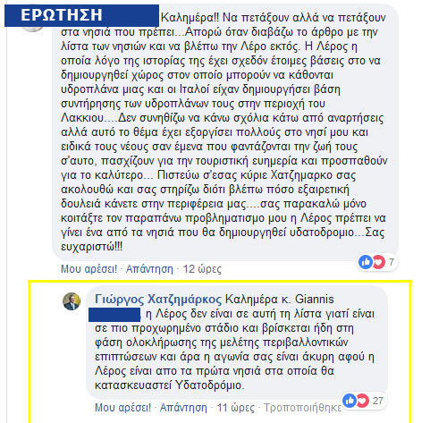 “…Η Λέρος δεν είναι σε αυτή τη λίστα γιατί είναι σε πιο προχωρημένο στάδιο και βρίσκεται ήδη στη φάση ολοκλήρωσης της μελέτης περιβαλλοντικών επιπτώσεων και άρα η αγωνία σας είναι άκυρη αφού η Λέρος είναι από τα πρώτα νησιά στα οποία θα κατασκευαστεί Υδατοδρόμιο”.