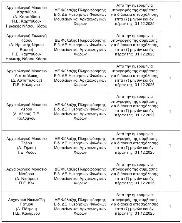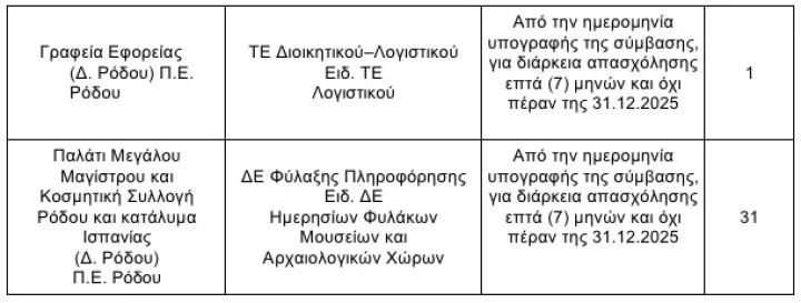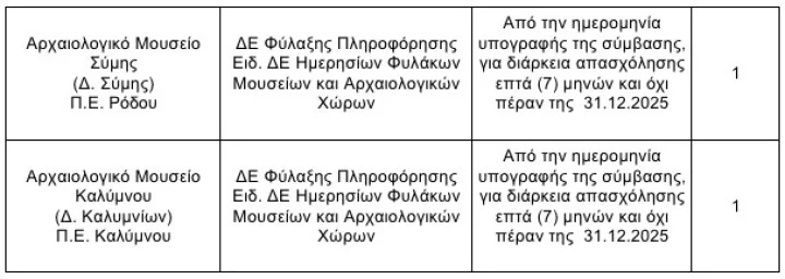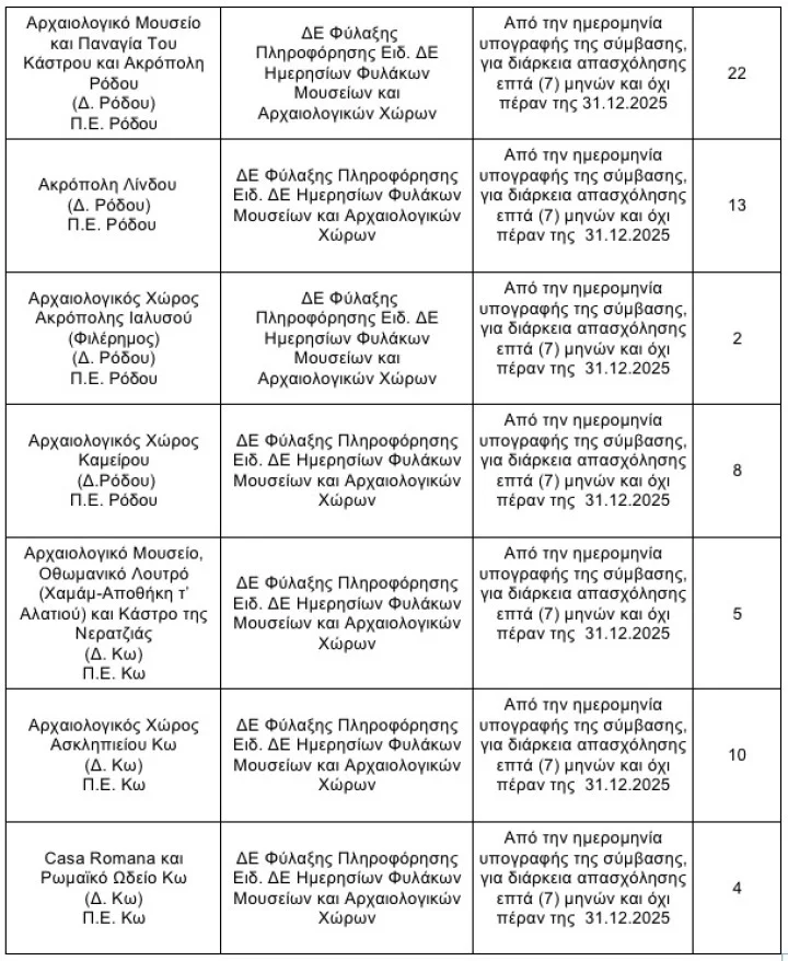 Σε ό,τι αφορά την περιοχή μας, θα προσληφθούν από την Εφορεία Αρχαιοτήτων Δωδεκανήσου συνολικά 105 άτομα.
