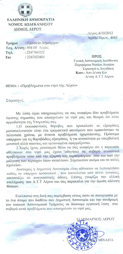 Προς ενημέρωση των κατοίκων της Λέρου, θα ήθελα να δημοσιοποιήσετε το σχετικό έγγραφο που είχα αποστείλει στις 4/10/2012, στην Γενική Αστυνομική Διεύθυνση”.